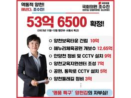 조수진 국회의원(최고위원, 서울 양천갑 당협위원장)은 지난 11월부터 12월 현재까지 행정안전부와 서울시로부터 확정된 양천구 특별교부금이 총 53억 6500만원에 달한다고 밝혔다.먼저 지난 11월 서울시 특