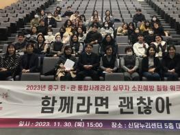 서울 중구의 민?관 사례관리 업무 담당자 60명이 한 자리에 모여 통합사례관리 방법을 공유하고 서로의 노고를 격려하는 ‘함께라면 괜찮아’ 가 지난달 30일 신당누리센터에서 열렸다. ‘사례관리’는 다소