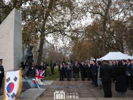 영국을 국빈 방문 중인 윤석열 대통령 부부는 11월 21일 오후 한국전 참전 기념비와 무명 용사의 묘에 헌화했다.영국의 한국전 참전용사들과 영국 왕실 대표로 글로스터 공작이 참석한 가운데 개최된 한국전