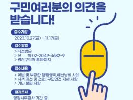 광진구의회는 오는 11월 20일 시행예정인 '2023년도 행정사무감사'를 앞두고 주민 의견을 10월 27일부터 11월 17일까지 총 22일간 접수한다.구의회는 구민들의 다양한 의견을 적극적으로 수용하고자 ‘행정