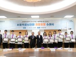 김현기 서울특별시의회 의장은 27일 제19회 항저우 아시안게임에서 뛰어난 성적을 거둔 서울시 직장운동경기부 선수 12명에게 의장 표창을 수여했다. 이날 표창을 수여받은 선수는 윤지수(펜싱), 김한솔(체