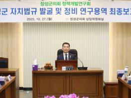 장성군의회 의원연구단체 ‘정책개발연구회’는 지난 27일 군의회 상임위원회의실에서 ‘장성군의회 자치법규 발굴 및 정비 연구용역 최종보고회’를 개최했다.그동안 정책개발연구회는 조례 발굴 및 정비