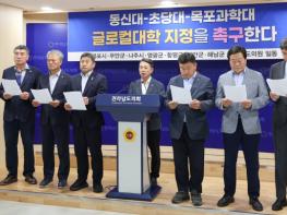 전라남도 서남부권 도의원들이 8월 26일 전남도의회 브리핑룸에서 기자회견을 열고 동신대-초당대-목포과학대 연합의 글로컬대학 본지정을 강력히 촉구했다.이날 기자회견은 이재태 의원(나주3)을 비롯해 최