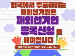 외국에서 투표하려는 재외선거인은 재외선거인 등록신청을 해야합니다.(등록신청기한: 25년 4월 24일까지)■ 재외선거인 등록신청대상자· 선거일 현재 만 18세 이상이면서, 주민등록되어 있지 않고· 제22대