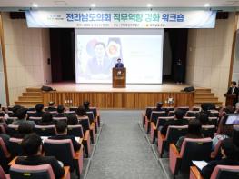 전라남도의회는 19일 전남여성가족재단 공연장에서 도의회와 시·군의회 직원을 대상으로 직무역량 강화 워크숍을 개최했다.이번 워크숍에는 전라남도의회사무처 및 시·군 의회 직원 150여 명이 참석했으며,