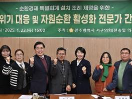 서구의회는 23일 의회 1층 소회의실에서 순환경제 특별회계 설치 조례 제정을 위한 '기후위기 대응 및 자원순환 활성화 전문가 간담회'를 개최했다.전승일 광주 서구의회 의장 주관으로 열린 이번 간담회는