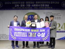 [중앙뉴스라인 = 전은희 기자] 2024년 11월 15일, 광주 서구 상무지구 JS컨벤션 2층에서 열린 공법단체 한국언론미디어그룹의 8주년 기념식 및 대한민국 의정대상 시상식에서 전라남도의회 정영균 의원이 '2…