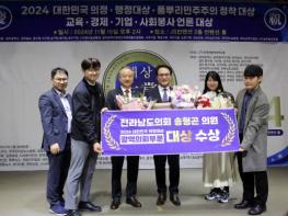 [중앙뉴스라인 = 전은희 기자] 2024년 11월 15일, 광주 서구 상무지구 JS컨벤션 2층에서 열린 한국언론미디어그룹의 8주년 기념식 및 대한민국 의정대상 시상식에서 전라남도의회 송형곤 의원이 '2024 대한…
