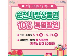 순천시가 5월 가정의 달을 맞아 오는 5월 1일부터 31일까지 순천사랑상품권 10% 특별할인 판매를 실시한다고 밝혔다.순천사랑상품권은 관내 식당, 마트, 시장 등 다양한 가맹점에서 사용이 가능하며, 현재