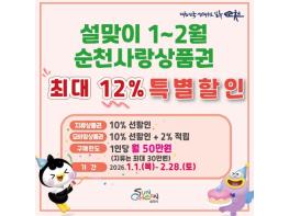 순천시가 새해와 설 명절을 맞아 2026년 1월부터 2월까지 두 달간 순천사랑상품권 할인 행사를 추진해 지역 소비 촉진에 나선다고 밝혔다.지류상품권은 구매 시 10% 선할인이 적용되며, 모바일 순천사랑상품