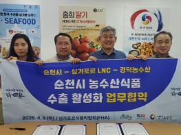순천시는 동남아 수출 시장 교두보 마련을 위해 지난 6일부터 11일까지 싱가포르, 베트남을 방문하여 ‘Made in 순천’ 농특산물 수출 시장 개척에 박차를 가하고 있다고 밝혔다.이번 방문에는 ㈜경덕농수산