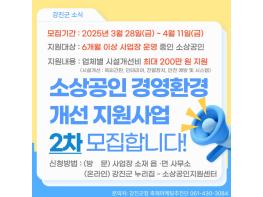 강진군이 이달 28일부터 2차 소상공인 소규모 경영환경 개선 지원사업 대상자 모집을 시작했다. 해당 사업은 소상공인에게 필요한 환경을 조성하거나 시설을 개선하는 등 사업 선정 시 안내에 따라 사업을