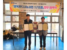 원산동 행정복지센터가 지난 27일 (유)팔금한우(대표 이영주)와 행복푸드나눔가게 17호점 업무 협약을 체결하고 현판식을 진행했다.이영주 대표는 이번 협약을 계기로 한우 불고기 10박스(80만원 상당)을 기
