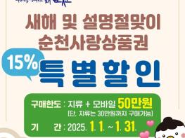 순천시는 다가오는 새해와 설 명절을 맞아 2025년 1월 1일부터 1월 31일까지 순천사랑상품권을 15% 할인된 가격에 판매한다고 밝혔다. 이번 할인판매는 지속적인 경기침체로 어려움을 겪고 있는 지역경제에