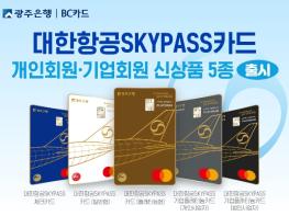 광주은행은 최근 대한항공 및 비씨카드와의 제휴를 통해 개인회원 및 기업회원 대상 카드사용에 따른 대한항공 마일리지 적립과 일상생활에서의 혜택 등이 탑재된 '대한항공 SKYPASS카드'5종을 출시했다고