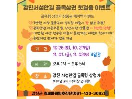 강진군이 ‘골목상권 첫걸음 이벤트’를 10월 26일부터 10월 27일, 11월 1일부터 11월 2일까지 나흘간 강진군 서성안길 일대에서 추진한다. 이번 이벤트는 지난 3월 소외된 골목상권의 활성화를 목적으로 한
