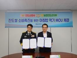 NH농협 진도군지부와 진도소방서는 9일 진도쌀 소비촉진을 위한 아침밥 먹기 업무협약(MOU)을 체결했다.이번 업무협약은 양 기관의 상호협력을 바탕으로 소방안전 의식 고취, 건강한 식습관 형성 및 아침밥