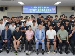광주광역시체육회가 12일 체육회관 2층 중회의실에서 ‘2024년 대학부 우수선수 장학증서 수여식’을 열어 장학금을 전달했다. 이날 수여식에는 전갑수 체육회장, 조선대학교 육상 노명래 감독과 대학부 우