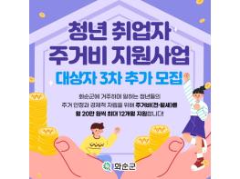 화순군은 8일 ‘청년 취업자 주거비 지원사업’ 대상자 9명을 오는 12일부터 23일까지 추가 모집한다고 밝혔다. ‘청년 취업자 주거비 지원사업’은 화순군에 거주하는 일하는 청년들에게 주거비(전·월세)