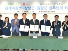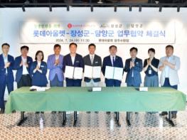 장성군이 24일 롯데아울렛 광주수완점과 업무협약을 체결했다. 롯데아울렛 A관 4층에서 열린 협약식에는 김한종 장성군수와 이병노 담양군수, 문중오 롯데아울렛 광주수완점 점장 등 다수의 관계자들이 참석