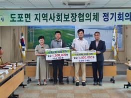 김재만 영암군 도포면이장단장과 양상현 도포면새마을협의회장이, 24일 이웃돕기에 써달라며 면 지역사회보장협의체 정기회의에서 각각 100만원씩을 지정 기탁했다. 김 단장은 지난해에 150만원을 기부하는