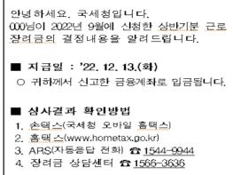 국세청은 코로나19 및 물가 상승 지속 등으로 어려움을 겪고 있는 일하는 저소득 근로자를 지원하기 위해 법정기한(12월 30일)보다 약 3주 앞당겨 오늘(12월 13일) 지급했습니다.올해 9월에 신청한 115만 가
