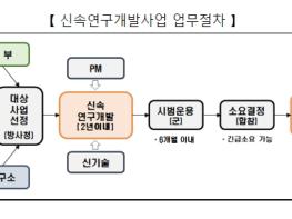 방위사업청은 기존의 무기체계 도입기간을 획기적으로 단축하기 위해 신설된 신속연구개발사업의 협약을 최초로 체결했다고 밝혔다.신속연구개발사업은 4차 산업혁명의 기술발전 속도에 발맞춰 신기술이 적