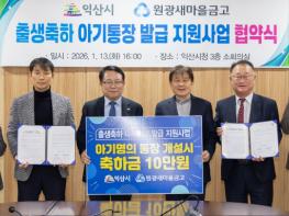 익산시가 원광새마을금고와 손잡고 출산을 축하하는 지역사회 분위기 조성에 나섰다. 익산시는 13일 시청 소회의실에서 원광새마을금고와 '출생축하 아기통장 발급 지원사업'을 위한 업무협약을 체결했다.