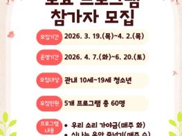 영광군청소년문화센터는 지역 청소년들의 건전한 여가 활동 지원과 자기계발 기회 제공을 위해 ‘2026년 상반기 방과 후 및 토요 프로그램’ 참가자를 모집한다고 밝혔다.이번 프로그램은 오는 4월 7일부터