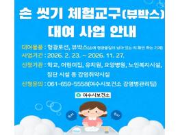 여수시보건소가 관내 어린이집, 유치원, 복지시설 등 감염 취약 시설을 대상으로 손 씻기 체험교구 대여 사업을 실시한다고 밝혔다.손 씻기는 감염병 예방의 가장 기본적인 건강 수칙으로, 흐르는 물에 비누