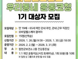 합천군은 개인별 체력과 건강 상태를 고려한 맞춤형 운동 프로그램 '우리 동네 운동코칭 : PT with U'에 참여할 1기 대상자를 모집한다고 23일 밝혔다.'우리 동네 운동코칭 : PT with U'는 1:1 맞춤형 개인