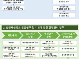 질병관리청 국립보건연구원은 첨단재생의료 현장에서의 환자 안전을 확보하기 위해 '첨단재생의료실시기관 안전관리 업무안내서'를 배포한다. 해당 안내서에는 첨단재생의료기관이 첨단재생의료 실시 과정에