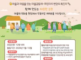 순천시는 마을공동체 만들기 공모사업의 원활한 추진과 주민자치·마을공동체 활성화 등 따뜻한 순천을 함께 만들어갈 2026년 마을활동가 12명을 모집한다고 밝혔다.이번에 모집하는 마을활동가는 마을활동가