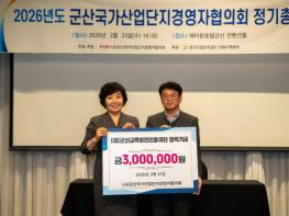 사단법인 군산국가산업단지경영자협의회(대표 김경희)가 지역 인재양성을 위해 군산교육발전진흥재단에 장학금 3백만원을 기탁했다. 금번 기탁식은 25일 (사)군산국가산업단지경영자협의회 정기총회 현장에