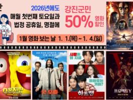강진군민이면 누구나 부담 없이 영화를 즐길 수 있는 강진영화관 ‘영화 보는 날’ 프로그램잉 2026년에도 이어진다.‘영화 보는 날’은 강진영화관을 중심으로 정기적인 할인 상영을 통해 군민의 문화 접근