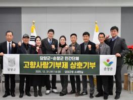 담양군은 지난 12월 31일 자매결연 지자체인 순창군과 고향사랑기부제 상호 기탁식을 개최했다고 밝혔다. 이번 기탁식은 양 지자체의 민간단체 대표들이 서로의 지역을 방문해 응원의 마음을 전하고, 각 50