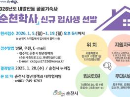 순천시는 수도권 및 인근 지역 소재 대학교에 재학 중인 순천 출신 대학(원)생에게 안정적인 주거환경을 제공하기 위해 순천학사 신규 입사생을 오는 19일까지 모집한다.모집인원은 총 70명으로 남자 26명,