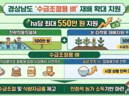 경남도는 쌀 수급 안정과 농가 소득 보전을 위해 올해부터 ‘논 타작물 재배지원 사업’에 ‘수급조절용 벼’를 신규 품목으로 추가하고, 전략작물직불제와 연계해 헥타르(ha)당 최대 550만 원을 지원한다고