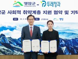 영암군이 두레청과(주)와 함께 새로운 나눔 모델을 통해 지역사회 상생에 나섰다.영암군은 18일 군청에서 두레청과㈜(대표 한수영)와 ‘사회적 취약계층 지원 협약’을 체결하고, (재)영암군미래교육재단에