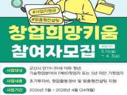 군산시는 혁신적인 청년 창업가를 발굴하고 사업정착을 지원하기 위한 ‘창업 희망키움사업(8기)’에 참여할 청년 (예비)창업가를 4월 3일까지 모집한다고 밝혔다.‘창업 희망키움사업’은 창업 초기의 어려