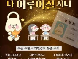 수험생 여러분! 다 이루어질 지니■ 수능 수험표 개인정보 유출 주의!- 수험표 대여 및 매매 금지- 이벤트 참여시 수험표 제출 금지- 소셜미디어(SNS) 업로드 주의