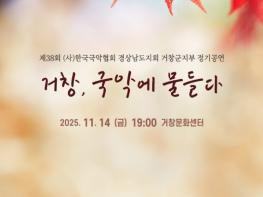 거창군민과 관객들에게 깊은 울림과 감동을 선사할 ‘제38회 한국국악협회 거창군지부 정기공연’이 오는 14일 오후 7시, 거창문화센터 대공연장에서 열린다.이번 공연은 한국국악협회 거창군지부(지부장 유