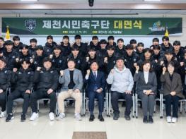 제천시민축구단 선수단과 구단주의 공식 대면식이 지난 11일 제천시청에서 열렸다.오는 24일 창단식을 앞두고 열린 이번 대면식에는, 구단주인 김창규 제천시장과 김용기 단장, 선수단 등 관계자들이 참석했