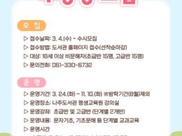 전라남도교육청나주도서관(관장 김의곤)은 오는 3월 24일부터 성인 학습자의 기초 문해 역량을 강화해 삶의 질을 높이고 지역사회 참여를 확대하기 위해 성인문해 배꽃학당을 운영한다. 수강 신청은 3월 4