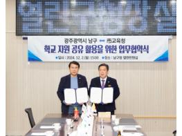 광주시교육청이 학교자원 공유 확대에 나선다.이정선 교육감과 김병내 남구청장은 2일 남구청 열린민원실에서 ‘지역-학교 자원 공유 및 활용을 위한 업무협약’을 체결했다. 협약은 학교 문화·복지시설, 주