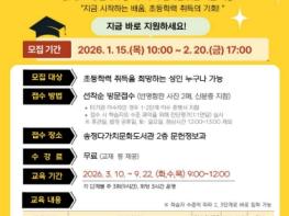광주시교육청송정다가치문화도서관은 ‘2026학년도 초등학력인정 성인교육’ 프로그램을 운영한다.이번 교육은 사회·경제적 이유로 학령기에 기초 교육을 받지 못한 성인들에게 초등학력 취득 기회를 제공하