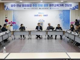 광주시교육청이 급물살을 타고 있는 광주·전남 행정통합과 관련해 교육계 의견 청취에 나섰다.시교육청은 14일 대회의실에서 ‘광주·전남 행정통합 추진 관련 교육가족 간담회’를 개최했다.이날 간담회는