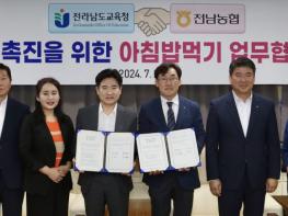 전라남도교육청과 전남농협이 29일 청사 비즈니스실에서 ‘쌀 소비촉진을 위한 아침밥 먹기’ 업무협약을 체결했다.이 협약을 통해 두 기관은 학생들에게 아침밥을 챙겨 먹는 건강한 식습관에 대한 인식을