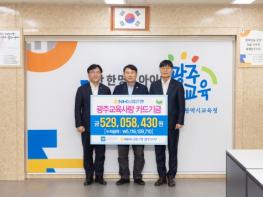 광주시교육청이 1일 NH농협은행으로부터 ‘광주교육사랑카드’사용으로 발생한 적립금 5억2천905만 원을 전달받았다. 이번 전달된 적립금은 시교육청 예산에 포함돼 앞으로 광주 학생들을 위한 다양한 사업