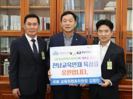 김철민 국회 교육위원위원회 위원장이 지난 18일 (재)전남미래교육재단에 소정의 장학금과 응원의 메시지를 전달했다.김철민 위원장은 이날 국회 교육위원장실에서 김대중 이사장을 만나 장학금과 함께 “전